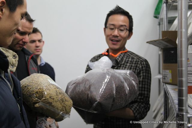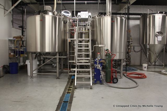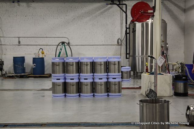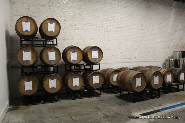 There are rooms of barrels where they’re aging beer in bourbon barrels, whiskey and wine barrels. This Sunday, Finback will release their barrel aged BQE beer brewed with cocoa nibs from Mast Brothers and coffee from Native Coffee Roasters in Queens, along with another barrel aged beer called Smoke Detection. It’s been harder and harder to procure barrels, says Basil, because of all the beer brewers using them now.
