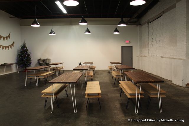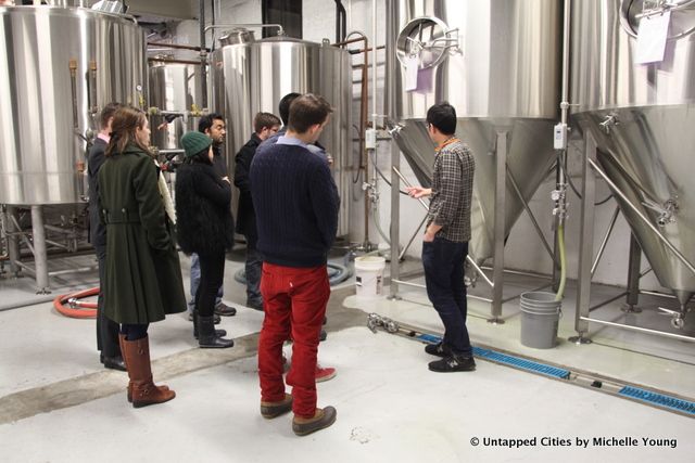 Last night, we headed to Finback Brewery for the Untapped Cities Holiday Happy Hour and Tour, a reader suggestion from our piece on the top microbreweries in NYC. Finback’s tasting room in Glendale, Queens is a hidden gem. You’d never guess from the street (unless it’s summer and they have the garage door open) there that there would be a warm and inviting bar and beer hall inside this nondescript warehouse building tucked within a residential neighborhood.