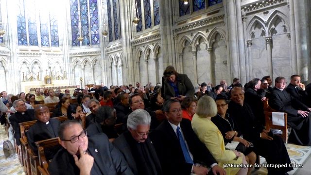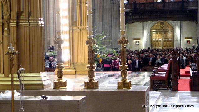 The flat-panel screens had a live shot of Fifth Avenue and the crowd of onlookers. Not long after we were told that the Pope’s helicopter touched down at Wall Street, a line of black SUV’s pulled up in front of the cathedral with Pope Francis emerging from his Fiat, right behind them. We watched as the Pope climbed onto the popemobile, slowly driving a small stretch of Fifth Avenue, waving to a cheering crowd that we could hear from inside the cathedral. The cathedral was quiet as we viewed the Pope being greeted by our Mayor, Governor, Senator and assorted dignitaries and friends of the church. Finally being ushered up the steps and through the main entrance by His Eminence, Timothy Cardinal Dolan and Reverent Monsignor Robert Ritchie (Rector), and the cathedral filled with music, applause and cheers.