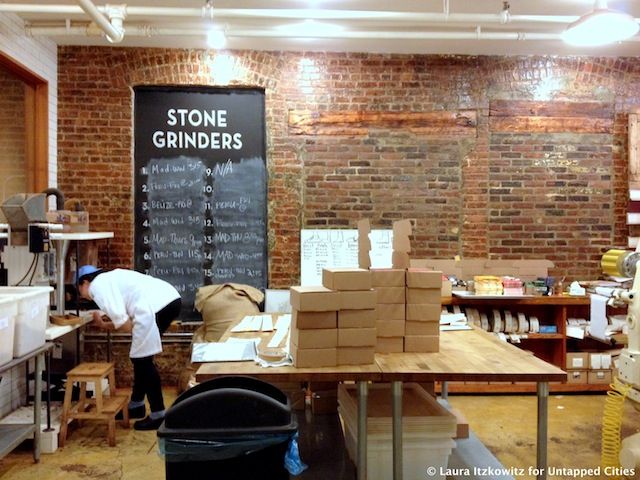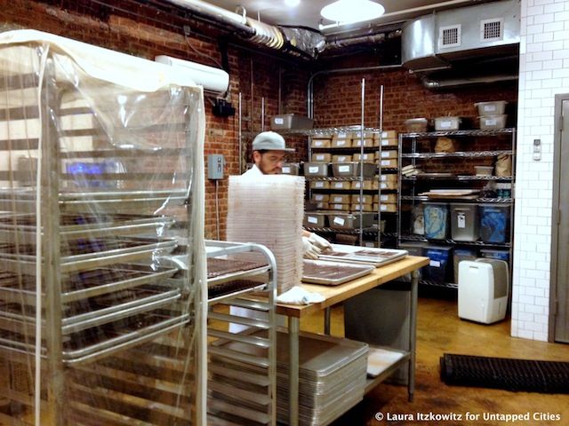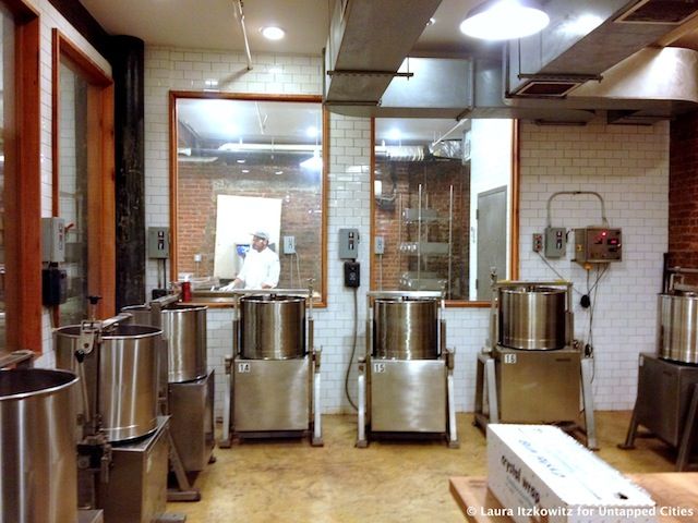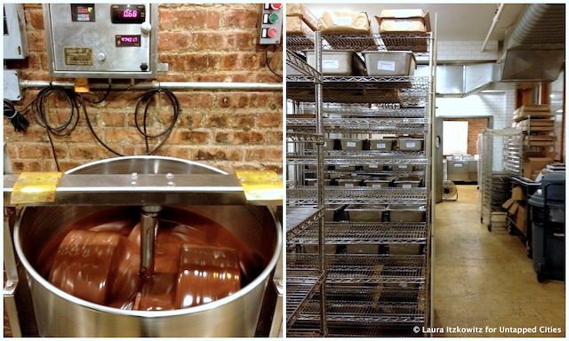 Finally, after the chocolate has aged sufficiently, the staffers melt it down again and pour it into moulds. At this stage, they might add sea salt, maple syrup, or Stumptown coffee to flavor the bars. They gave us a taste of the Reynard Granola chocolate bar, made with their signature Brooklyn blend chocolate (73% cocao) and granola from Reynard, the restaurant inside the Wythe Hotel. Those bars are sold exclusively at the Mast Brothers shop and put in the rooms of the Wythe.