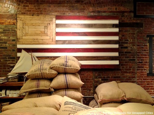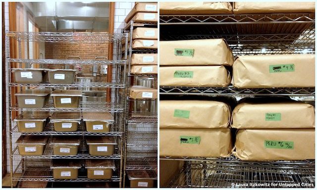American craft chocolate—for the Mast Brothers, at least—means only using the highest quality ingredients. The only things that go into their chocolates are single origin cocoa beans and organic cane sugar, which they source directly from farmers around the world. At the front of the shop, sacks of chocolate from Belize, Madagascar, Papua New Guinea, and the Dominican Republic are piled up.
