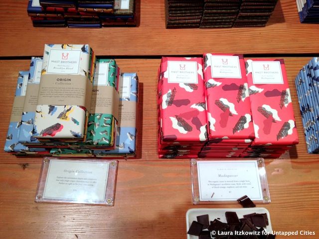 If you were wondering about those beautiful wrappers, they’re designed by the Mast Brothers’ in-house art director and printed locally in Long Island City. Each bar is wrapped in gold foil (the only thing these chocolates have in common with Willy Wonka’s) and then in paper.