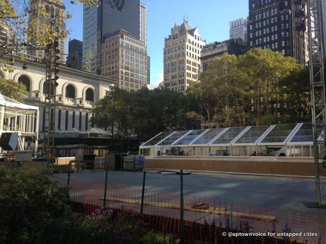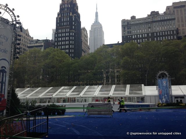 Winter’s here early in Midtown as Bryant Park‘s annual Winter Village (presented by Bank of America) is back in town. For the past two weeks, crews have been working to set up a 170′ by 100′ skating rink in the middle of Bryant Park, surrounded by various holiday shops that will be open throughout the holiday season. We’ve been taking daily photographs as it all comes together.