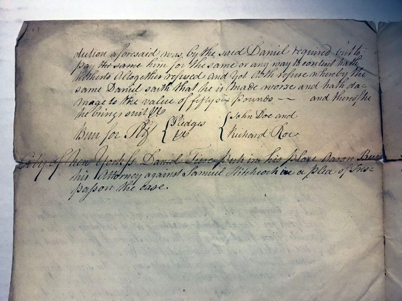 A document signed by Aaron Burr for a civil proceeding, found in the same box as the one from Hamilton. Burr is also representing a plaintiff in this case.