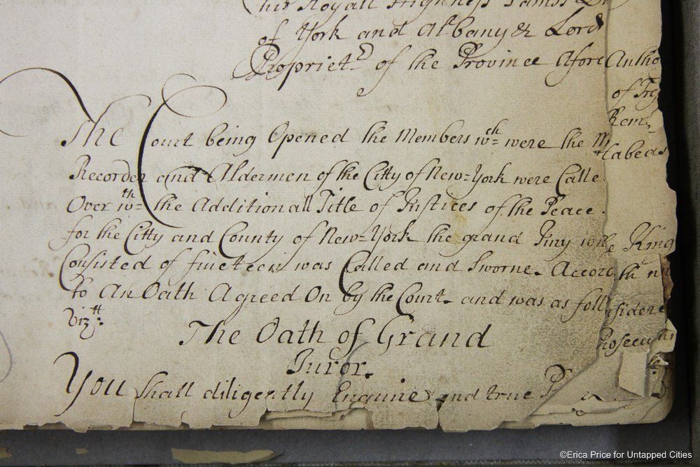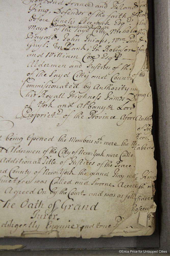 There is also the earliest record that we will be given to the New York State archives and its material and state contrast sharply with the parchment document. It dates to 1681 from the Court of Assizes, a predecessor to the Court of Appeals, the highest court in New York State. Huth says, “It’s still readable, but very fragile. There are voids where paper has flaked away…After this court, the only way in 1681 to have a chance to win in your case if you lost in this court was to go to the King. And King didn’t want to talk about many people.”