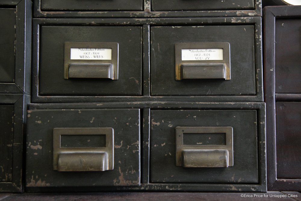 In the room we broadcasted live from, the writs were located in metal Woodruff files an advanced filing system developed during the Civil War. “Filing before used to be, you bundled things and put them in piles. Unless you rolled [the files] and put them in piles. This kept them in some semblance of order. They could logically go back to them,” says Huth.