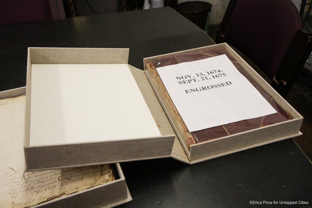 On another floor, are documents and books that have been archived carefully and placed into cases. One is the very oldest document in the archive, from 1674. It details the re-establishment of the English court, following the second surrender of New York from the Dutch to the English in February, 1674. One of the signers of the document coordinated this very surrender. Notably, this new document does not include Dutch signers, a reflection of the erosion of trust that resulted from the short, military re-takeover of New York which only lasted about six months.