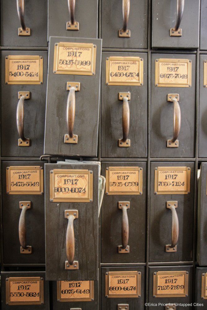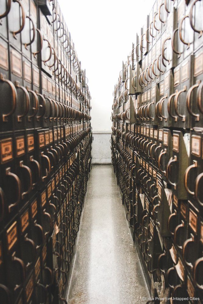 One room in the archives is of particular importance to the staff. It has been preserved for future generations, in the event the rooms on these archive floors are redone in the future, as more records are moved elsewhere. As van Nostrand says, the idea is to “leave it as a symbol of what it was like when it was first built. [There will be] one room not redone.” Here, the documents have been already removed for the most part but the layout, the Woodruff filing system, light sconces and more will remain intact.