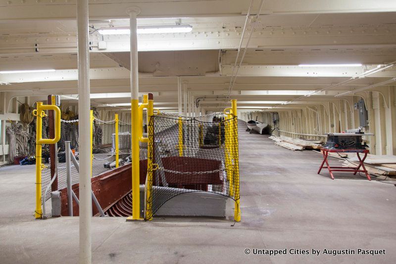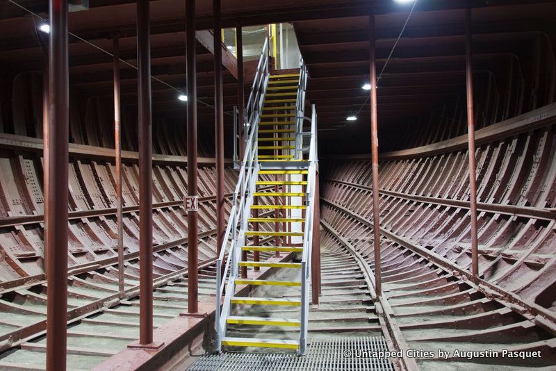 We were then allowed into the hull, an area of the ship that will remain off-limits to the public (unless you take our upcoming tour exclusively on Untapped Cities with the South Street Seaport Museum – sign up for advance notice below). “There isn’t a ship in the world that has a space like this,” Boulware announced, before running to the other end of the cathedral-like space to show us just how large this space is. Here, you can see the wrought iron bones of the ship, the original water tank in roughly its proper position, the hatch where the cargo would go down, and part of where the anchor chain would be stored. A modern vent has been added to keep the moisture down.