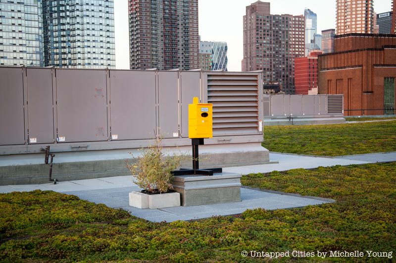Other institutional partners monitoring wildlife and environmental activity on the rooftop include Fordham University, Drexel University and Cooper-Union. Amidst the sedum, there are two birdhouses for kestrel falcons, five species of bats and two beehives. There have been baby geese, moved gingerly to a wildlife preserve by the Javits Center staff, and baby seagulls. There is talk of introducing lizards who may attract additional bird life. There’s also a climate station.