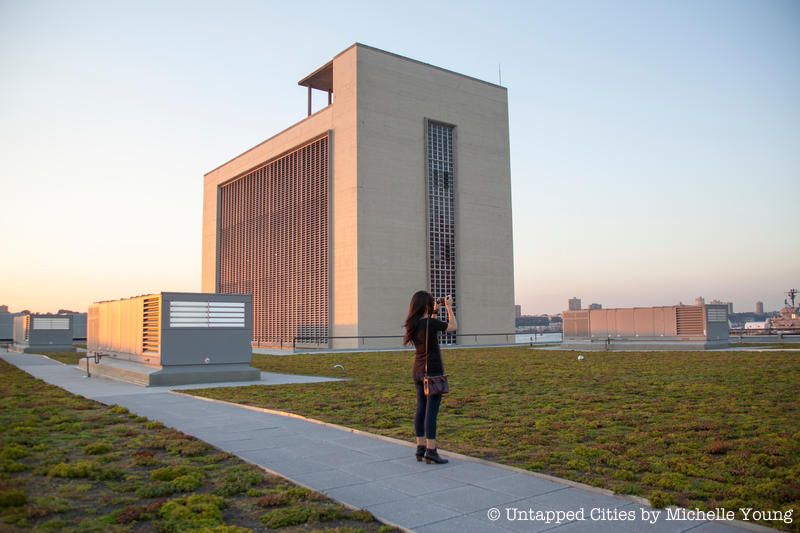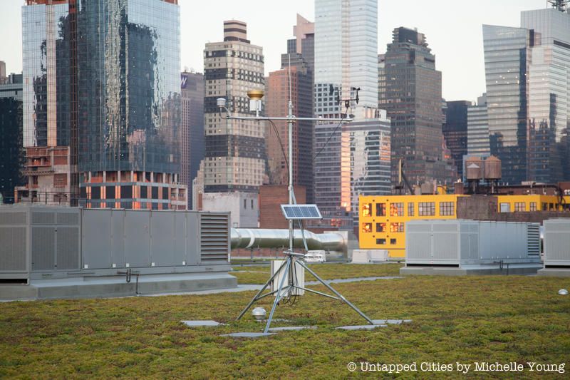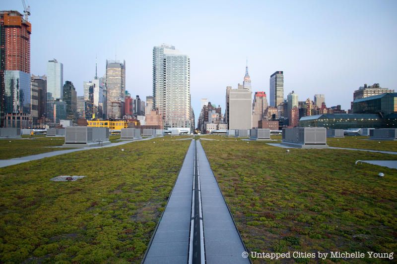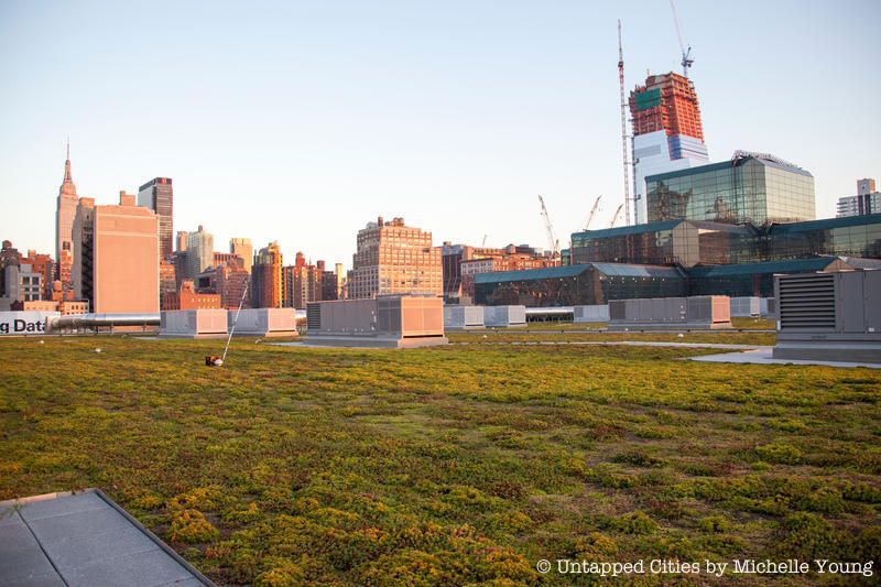 The green roof, by Xero Flor, is part of the $463 million renovation to the Javits Center by FX Fowle and Epstein, which notably included a replacement of the recognizable glass facade. Now of a less-reflective fritted glass and tinted in blue, the Javits Center has the dubious distinction of being the number one killer of birds in New York City. In fact, it reduced bird kills by 90% and for its efforts, the convention center received an award from the Audubon Society, now a partner in the activities on the roof.