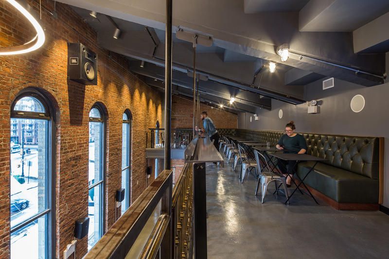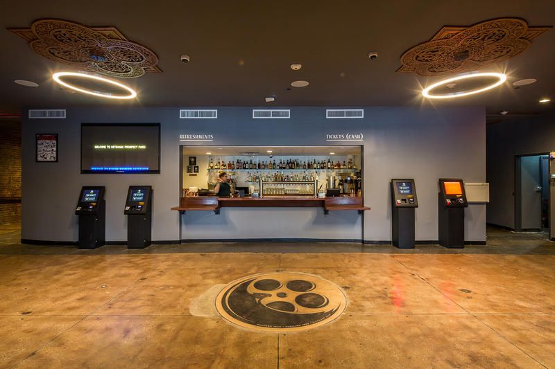 The mezzanine level of Nitehawk now offers views of the nearby Prospect Park and a second level bar. In order to make the upper level accessible and still adhere to landmark regulations, the renovation team had to get creative. The elevator that Nitehawk added to the building, which makes the structure totally accessible to for the first time in its history, pops-out slightly from the original structure.