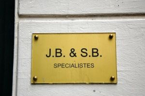 From top: Fake address sign, company sign and the real window of the building to which the fake door is attached to