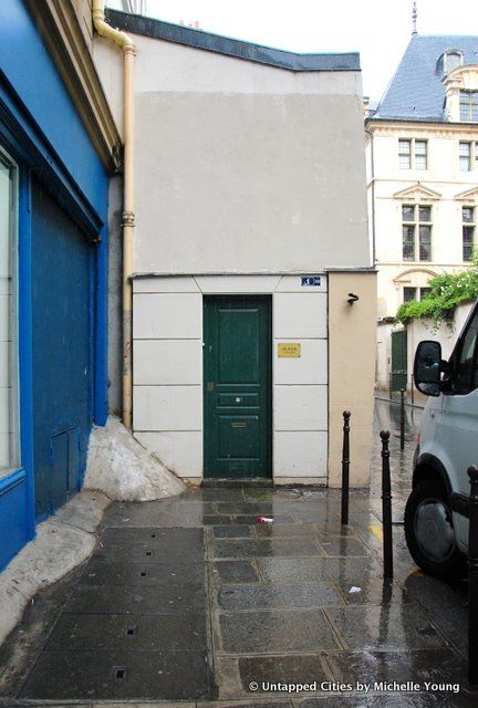 BldgBlog recently posted about a door to nowhere in Paris, installed four years ago in the 3rd arrondisement. Complete with fake address, facade, faux business sign and a Parisian-style door with a central doorknob (now missing), it still exists today. The “bis” in the address is an address that was designated when a lot was split. “Bis” is also used in music, to mean “repeat, “twice,” or “encore.” You will also see addresses labeled “ter.” Though “regularly graffitied it is even cleaned by the city service,” reports artist Julian Berthier who installed the facade with Simon Boudvin in thirty minutes on an early Sunday morning in 2006.