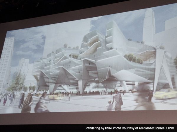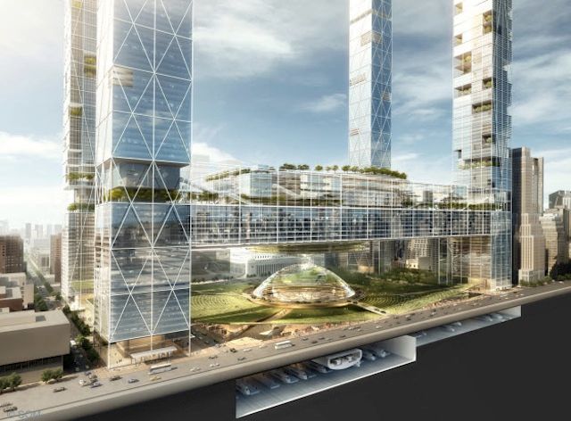 Skidmore, Owings & Merril called for a reconsideration of values which the station represents. SOM expanded the site to twice its current square footage, lifted the structure up and proposed an open green public space on the ground level. The firm sees the new complex as a cultural destination as well as a point of access to fast speed train and subway systems.