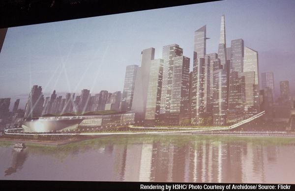 All four firms that participated in the challenge recognized that one can’t solve the problems of Penn Station without boldly recalibrating the notions of its site and its role in the urban fabric. H3 Hardy Collaboration Architecture proposed to move part of the complex (i.e. the new Madison Square Garden) to the waterfront at West 34th Street, create an elevated pedestrian promenade and a Pier park. An event hall and multiple skyscrapers with a mix of uses would bring economic and cultural vibrancy to the area.