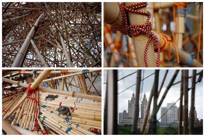 According to the description, “Set against Central Park and its urban backdrop, Big Bambú suggests the complexity and energy of an ever-changing living organism.” But what I appreciated most was the evidence of construction that was left on the rooftop, adjacent to the structure: a ladder, a storage of 40 foot bamboo poles, a makeshift tarp: