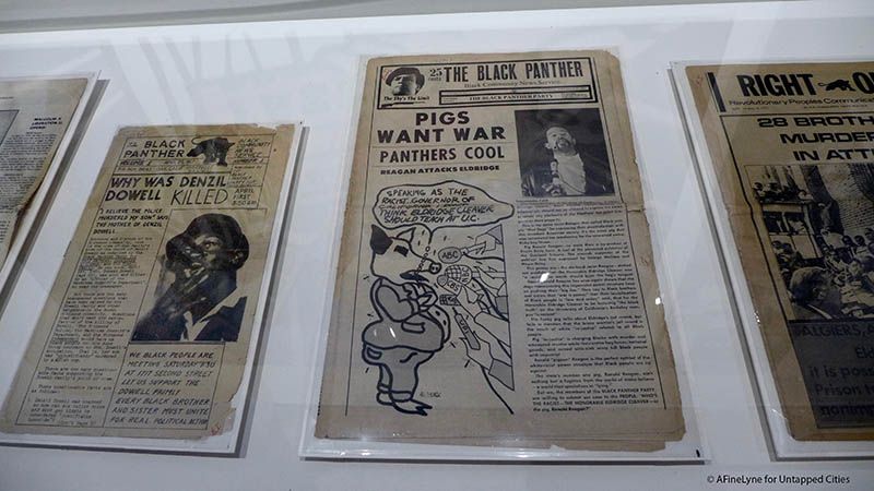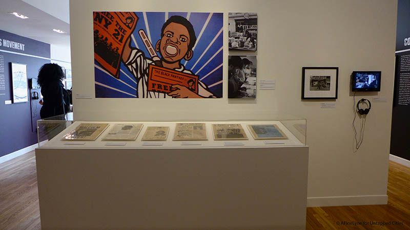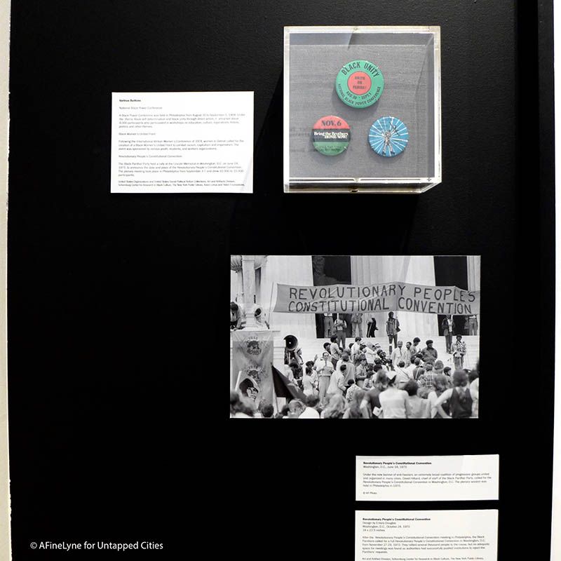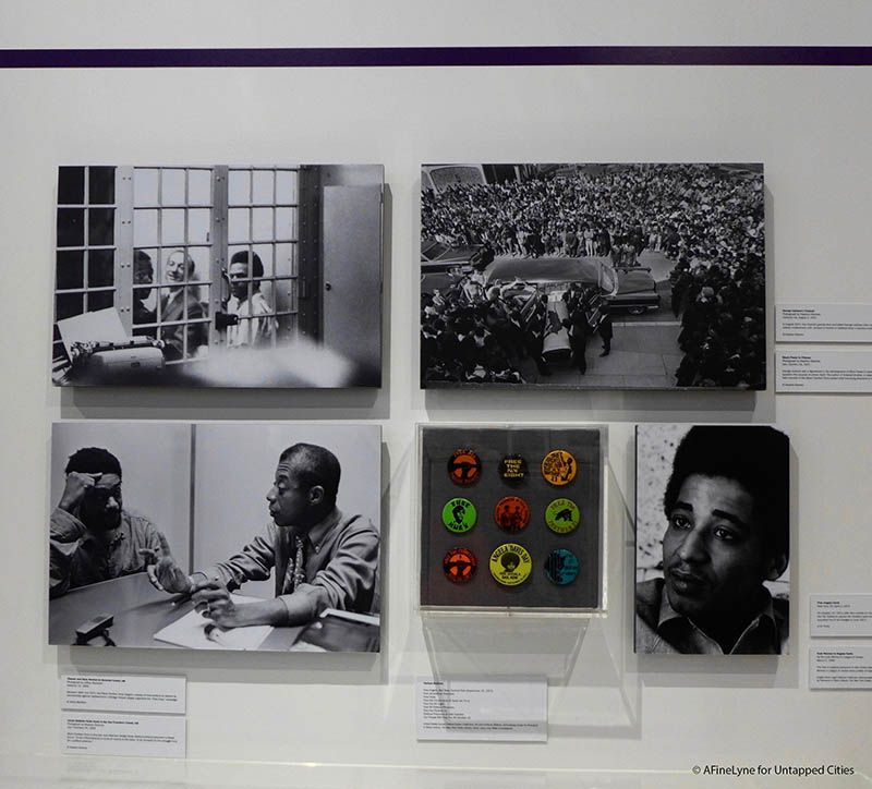 Photographs of Eldridge Cleaver, Huey Newton, James Baldwin, and Black Panther Party co-founder and chairman, Bobby Seale, are prominently displayed, alongside original buttons, flyers, and pamphlets. The first issue of the publication The Black Panther, dated April 25, 1967 and published by Bobby Seale and Elbert Howard is on view (above photo).