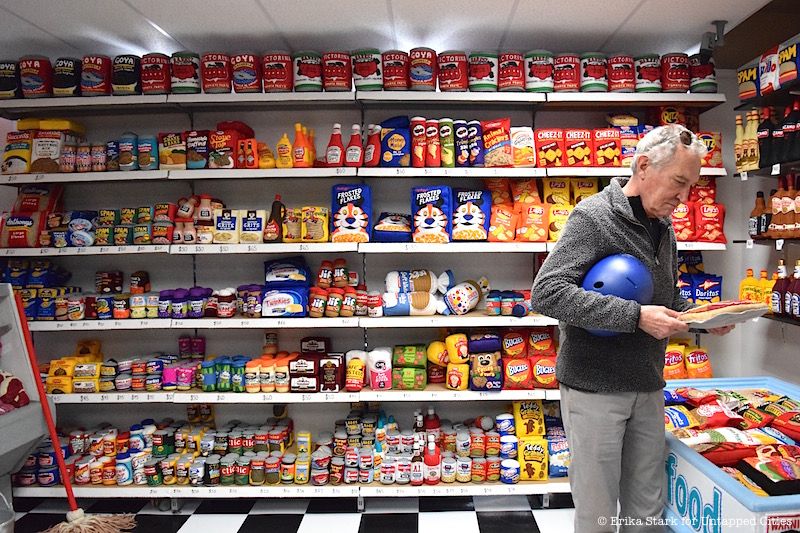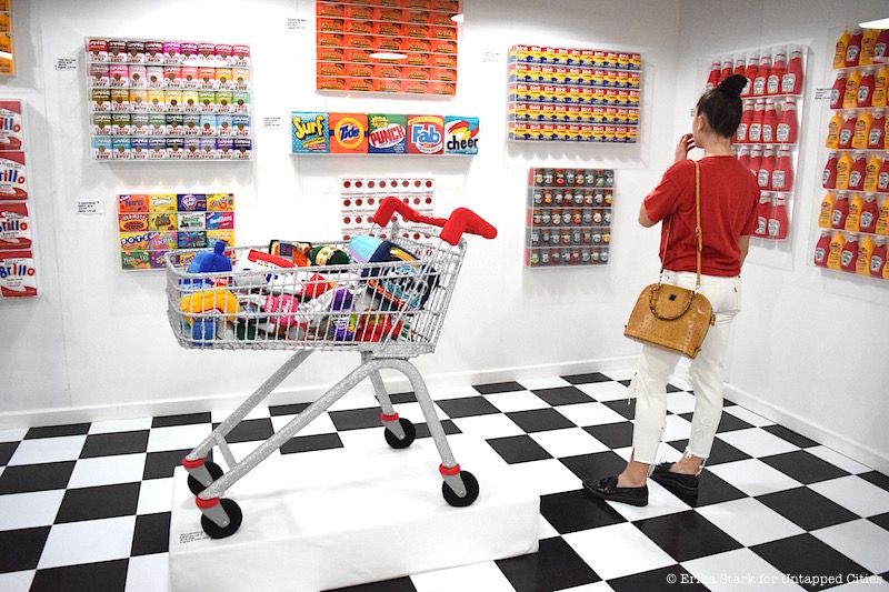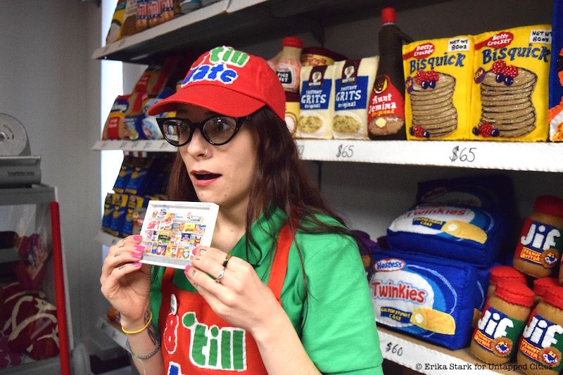 Just beyond the main bodega is a slightly more formal gallery of Lucy’s work where framed food items going for thousands of dollars are for sale. In the middle of the gallery is a shopping cart filled with stuffed replicas of the items most often shoplifted in convenience stores.