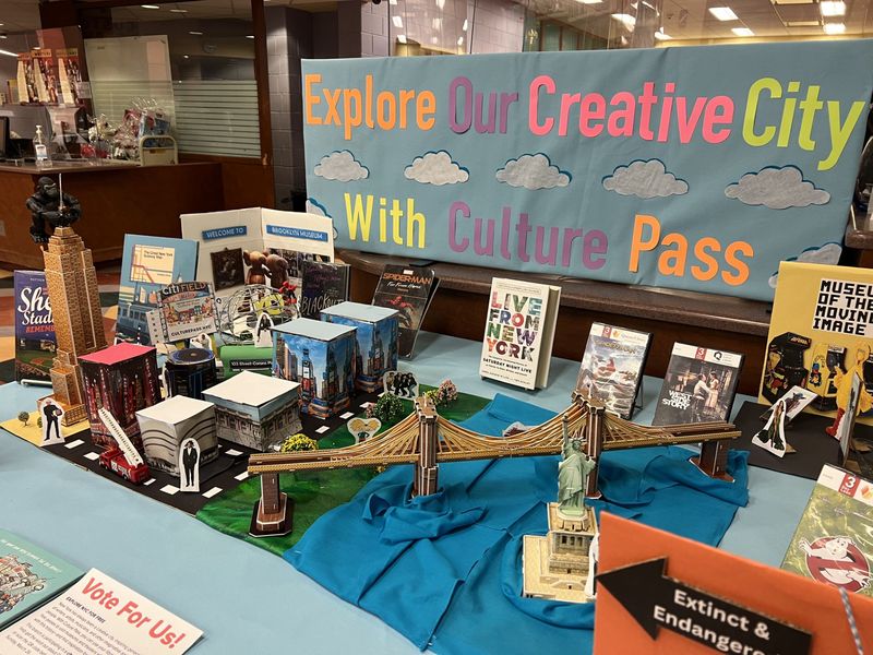 The book display contest, hosted by Culture Pass, asked libraries across New York City to create displays based on the theme of The Creative City. All of the branches approached this topic in their own unique and impressive way. Some libraries recreated the city skyline or made 3D miniatures of famous landmarks. Others went with a subway theme. A few kept the visuals simple and displayed a highly curated selection of books that highlight the people and places of the city. When you go to vote, you can read a message from each library that describes their approach to the theme.