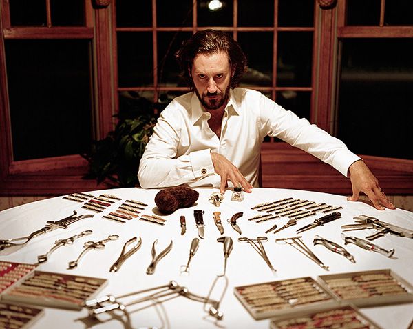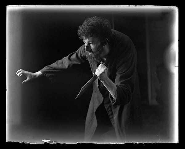 One of the best images in the exhibition is Covert’s reinvention of Veitch’s picture showing a man holding a dagger, presumably an actor playing a villain in a theatrical production. In Covert’s version, Covert himself is in the center of the photograph, seated in a rather macabre setting with knives and blades laid out on a table. With his eyes staring right at the viewer, Covert looks sinister and brooding, with not a trace of the affable man that he actually is. Look back at the original image, and then you’ll find yourself questioning the line between fact and fiction.