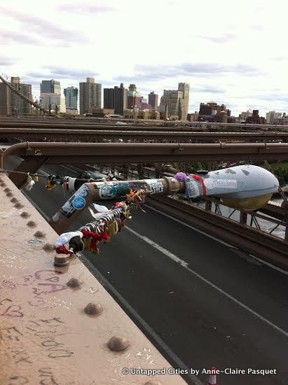 Where there are love locks, there are police cutting them down. Sometimes, it’s to keep a bridge from collapsing, as the case is on Paris’ Pont des Arts. In typical New York City style, the love locks are being complemented by trash, bras, condoms and more on the Brooklyn Bridge these days. Still, while The Washington Post reports that more than 9,000 love locks have been cut from the Brooklyn Bridge since last winter, and The NY Daily News found last month that “only a small strip of the bridge walkway appears to be the unofficial lock zone,” we discovered this past week that the locks are creeping back into some more adventurous areas., like the lamp posts above the roadway.