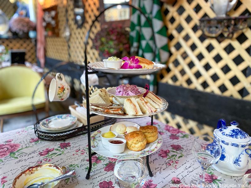 In the parlor, welcoming tufted chairs and couches along an exposed brick wall anchor the separate seating areas already set up for high tea. Even more importantly for these times, the set up conforms to New York City’s current COVID-19 regulations for indoor dining. But the real highlight is the backyard patio.