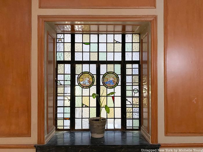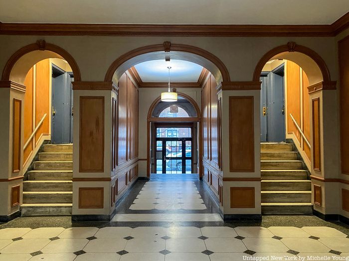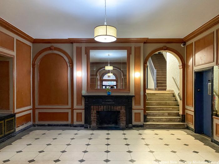 Emhoff’s building was constructed in 1936 and is a rental-only building with 44 apartments. It is six floors tall with a fairly spacious lobby off of which a handful of ground floor apartments are located. The lobby has a decorative brick fireplace with a mantel surrounding it, as well as two stained glass windows. A single elevator leads up to the apartments above the ground floor.