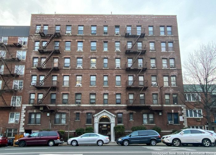 City records show that there was a garage (“for 3 cars”) located at the site prior to the apartment building that stands today at 1480 Ocean Avenue. The garage was completed in 1926. Ten years later, the new six-story building was completed which originally contained apartments for 45 families. This section of the block looks virtually unchanged from that time until now — you can see a 1940s tax photograph of the building at 1480 Ocean Avenue and its neighbors here.