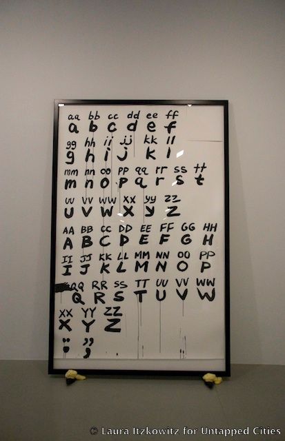 If Denes references geometry in her drawings, the other artists in the exhibition reference more creative domains such as literature and art history. Both Man Ray and Paul Chan reference the Marquis de Sade. In Man Ray’s Imaginary Portrait of the Marquis de Sade, a rather cruel-looking man made of stone gazes at a castle in the background. For The body of Oh there is no one one (truetype font), Paul Chan created a functional font from the Marquis de Sade’s writings. Though the letters are clear and bold, the ink drips down the page in places, reminding us of the sometimes messy and uncontrollable nature of the human body.