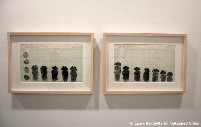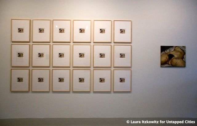 Yet, the exhibition isn’t nearly as juicy as one would expect from the title. The artworks, arranged in typical Chelsea fashion on blank walls in an otherwise empty space, seem almost cold and cerebral. This might seem like a harsh criticism, but perhaps that’s the point: to present works of art that question the intellectual discourse surrounding sexuality. Immediately upon entering the gallery, one sees a series of imprinted drawings by Agnes Denes, in which a sex organ has been stamped onto a piece of graph paper like a fingerprint. In one drawing, a breast sits placidly under the type of gridded sphere we used to draw in geometry class. Another drawing, titled Investigation of World Rulers: “Napoleon Overlooking the Elba”, shows penises stamped onto the paper in a row almost like a graph. This incongruous marriage of sex and geometry seems strange or absurd, but according to the curators seeks to “insert the body and its amorous instruments directly into the grid-like matrix of the rational.” The very phrase “amorous instruments” draws attention to the sometimes mechanical motions of our own bodies.