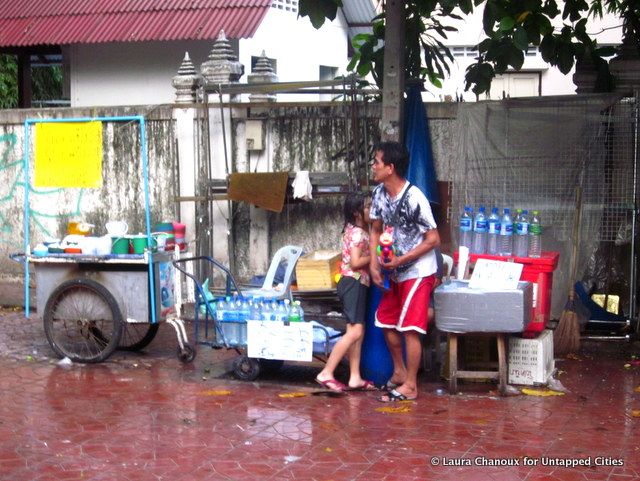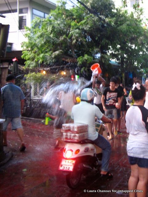 With the saturation of water everywhere, there are few ways to avoid getting wet during Songkran. Shopkeepers and people working at street side food carts are generally protected from water, despite being just at the edge of the soaking mass of people. For those who want to stay dry, it is nearly impossible. While I was sitting in an open-air restaurant before joining the celebrations, a damp woman cut through the restaurant to avoid a man with a hose standing just outside. “I have a laptop!” she explained before sneaking out the side door.