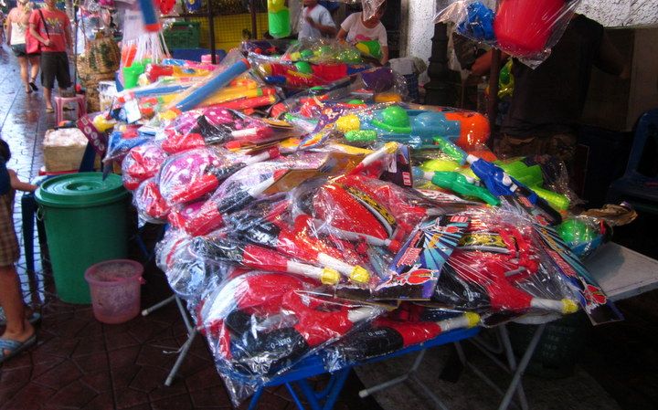 In the tourist areas surrounding Khao San Road, Thais and thrilled visitors prepare in the days before April 13, buying water guns of all sizes and plastic pouches to protect ID cards and other non-waterproof items. By April 12 the holidays have already begun. Tuk-tuk drivers sit at the edge of the road, squirting passersby. Children run around with small buckets of water, dousing anyone within reach. Many stalls selling squirt guns also have buckets of water for refills. Some enterprising businesspeople charge five baht per refill while others sell bottles of tap water to fill guns on the go.