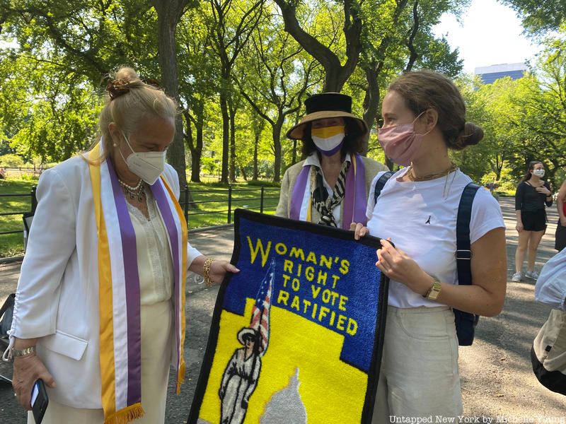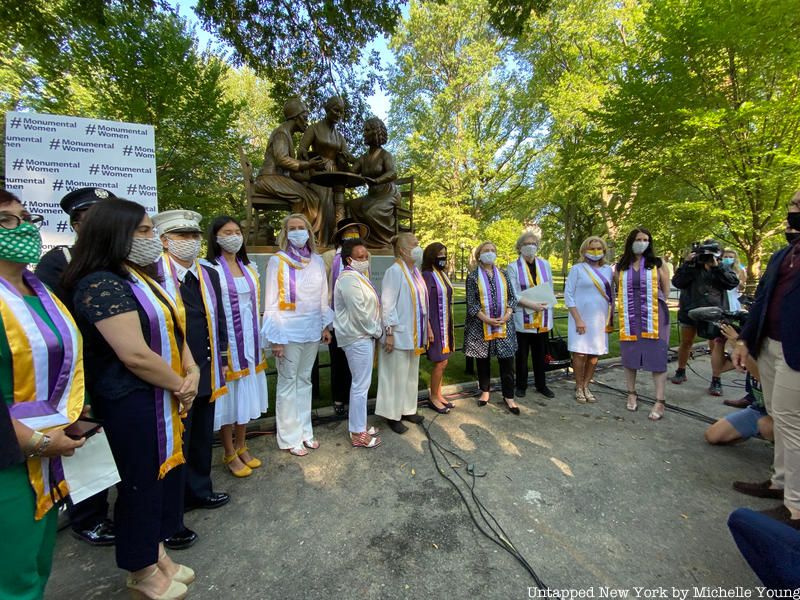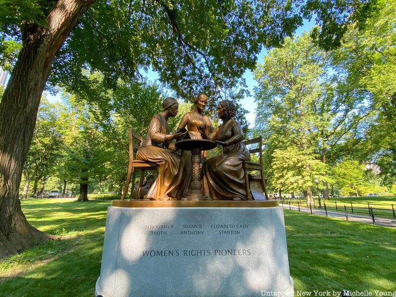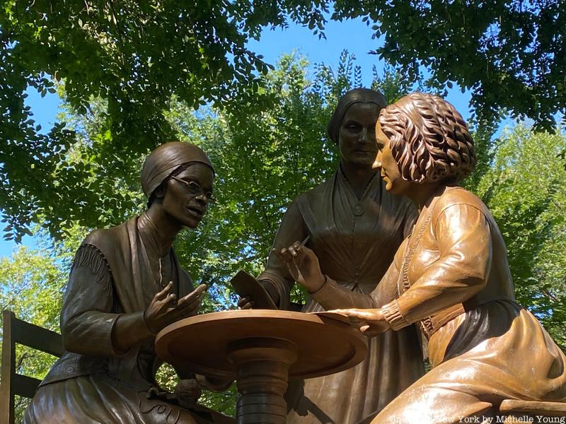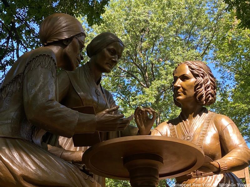This morning, the Women’s Rights Pioneers Monument depicting Sojourner Truth, Elizabeth Cady Stanton and Susan B. Anthony was unveiled on Literary Walk, on the occasion of the 100th anniversary of the ratification of the 19th Amendment which gave women the right to vote. The sculpture depicts the three women gathered around a table for a possible strategy meeting, with Anthony standing in the middle holding a pamphlet that reads “Votes for Women,” Stanton on her left holding a pen, and Truth in the midst of speaking. All three women are not only Women’s Rights pioneers but also New Yorkers.