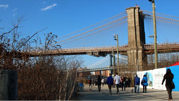 Brooklyn Bridge (Note the water at the current location of Brooklyn Bridge Park, constructed atop piers).