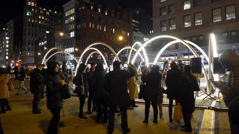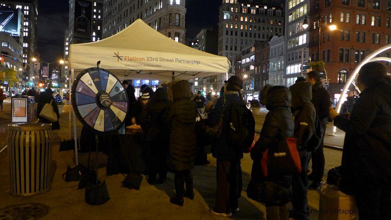 The winner of the Third Annual Flatiron Public Plaza Holiday Design Competition was unveiled at the intersection of Fifth Avenue, Broadway and 23rd Street this week, and we were on hand for the opening reception. Sponsored by the Flatiron/23rd Street Partnership Improvement District (BID), and the Van Alen Institute, the winning proposal was conceived by the architectural design firm, LOT, based in New York and Greece.