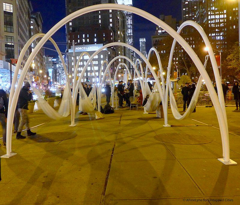 Entitled Flatiron Sky-Line, the series of ten large contiguous arches come alive with the addition of suspended hammocks, lined in LED lights inside the white powder-coated steel tubes. The hammocks are situated in clear view of the historic Flatiron Building and Empire State Building, and in between Madison Square Park and Eataly.
