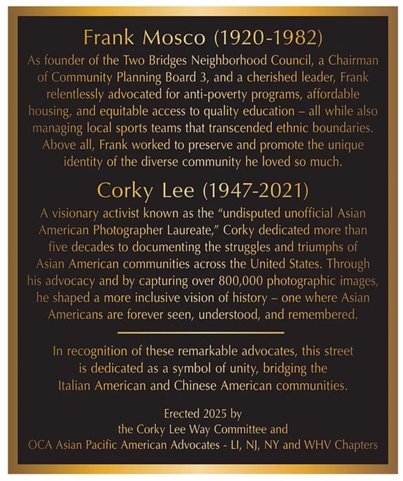A plaque honoring Frank Mosco and Corkey Lee, an Asian American photojournalist and activist, was unveiled on the exterior of Hop Kee Restaurant in June 2025.