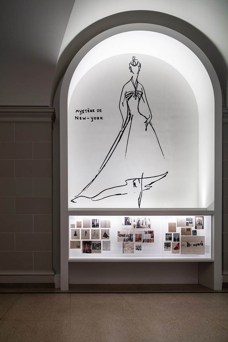 Each section feels like falling into not only a fashion designer’s world but an artist’s evolutionary journey. This first section is dedicated to the relationship between Christian Dior and New York. In 1947, Neiman Marcus invited Dior for his first trip to the United States to receive the prestigious Award for Distinguished Service in the Field of Fashion. When Dior arrived in New York, it was love at first sight. He fell in love with the architecture of the city, the beauty of the city, and the style of the American woman. It was then he decided in 1948 to open Christian Dior-New York boutique in the Hecksher Building (Crown Building) at 730 Fifth Avenue.