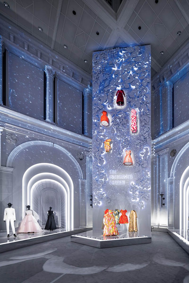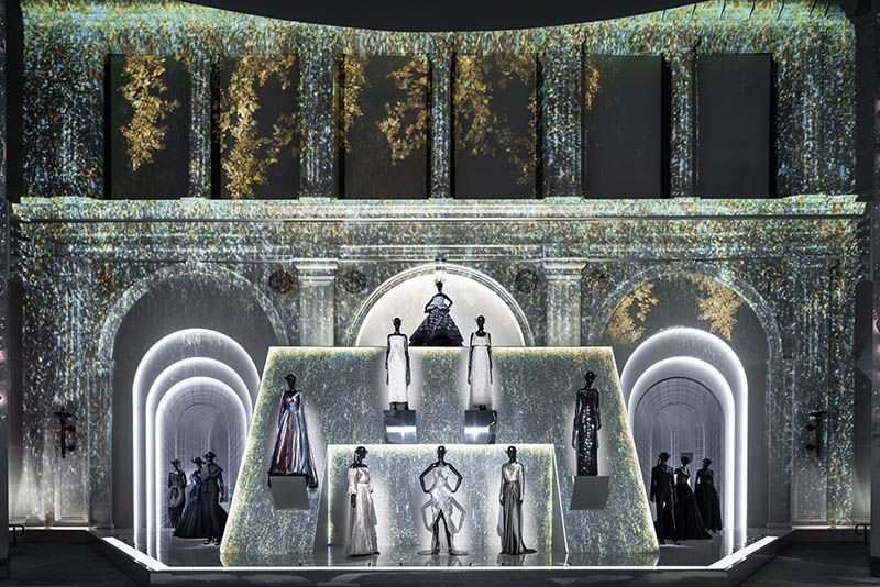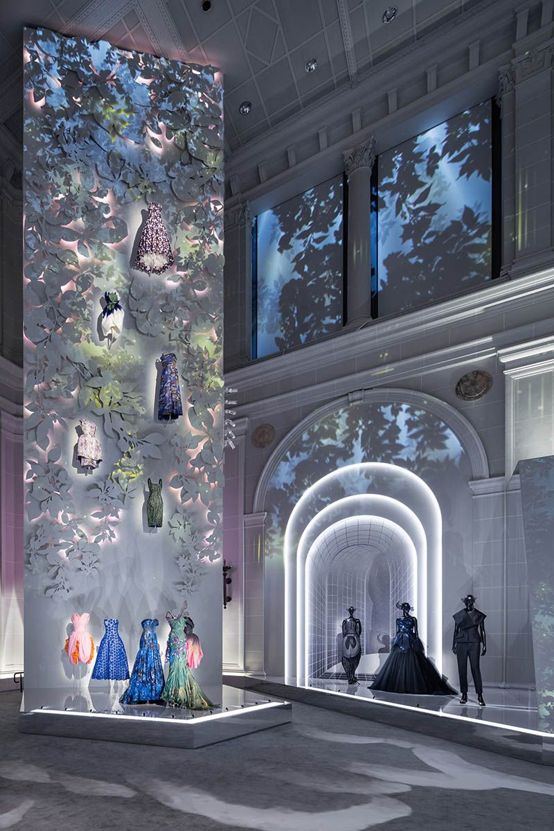Another magnificent section that seamlessly follows after “Colorama” is “The Ateliers.” It is based on the Dior studios, also known as, workrooms, which are “the cornerstone of the fashion house,” this is the fundamental home of the seamstresses who spend countless hours working on a single design. The ateliers create test garments, also known as toiles, based on drawings by the artistic director or the designer. These sketches are the lifeline of every starting collection. Inhabited in a brightly lit oversized white room, a collection spectrum of haute couture dresses on bust forms are presented, stacked over one another until they reach a mirrored ceiling, each representing the three-dimensional toiles.