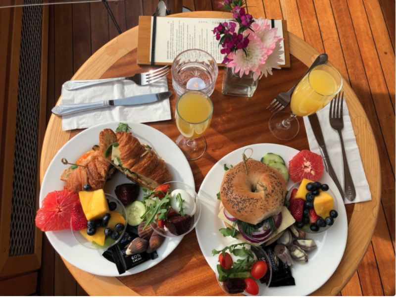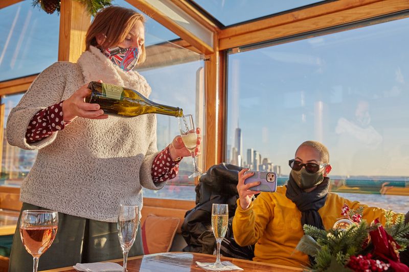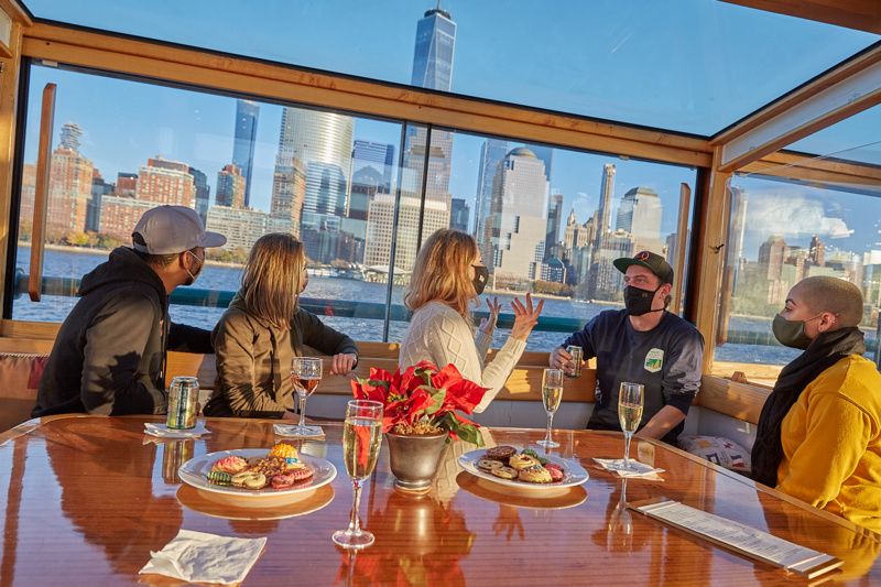 As you sail around Manhattan, you will be treated to a three-course prix fixe menu served at your very own private table. The menu includes New York State foods and local goods from New York City purveyors like fresh bagels and bakery items, seasonal fruit, craft sausages, kale salad, stuffed quiche, classic smoked salmon and pastries. To ensure the health and safety of guests and staff, seats are assigned and tables are separated by plexi-glass.
