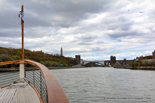 As we sailed north, along Manhattan’s iconic skyline, the tall, taller and tallest of its architecture, soon blurred into a forested landscape and rocky terrain, reminiscent of the Mannahatta that Henry Hudson discovered four hundred years ago. The transition was quite evident as the Untapped Cities crew took to the waters aboard the classic harbor line yacht ‘Manhattan ‘ inspired by the famous (and infamous) commuter yachts of the roaring twenties. The three hour spectacle- called the Around Manhattan Architectural tour sponsored by the New York chapter of American Institute of Architects, offers some stunning insights into the past, present and future of the ever evolving city and its waterfront.