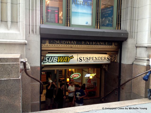 Vintage subway entrance at the Trinity Building at 111 Broadway with Subway and Suspenders Bar & Restaurant.