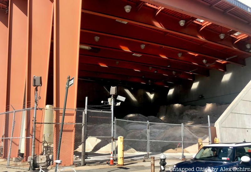 Here’s the Lower East Side salt shed situated underneath an overpass of the Manhattan Bridge and located right next to the Murry Bergtraum Softball Field by Pike Slip. Notable mostly for its location, this uniquely placed salt shed doesn’t have an unloading area, so loads of salt have to be pulled out of the back of the trucks directly.
