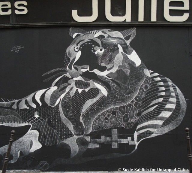 Back on the street art tour, we pull up in front of giant self-portraits of French-German artists Janna & JS on the side of an apartment complex in the 13th. “What do you see here?” asks Demian, like your favorite art teacher. There are no wrong answers; he merely asks you to interact with the art, question it, question the environment it’s in, and explore your relationship to it. Which is the function of street art, after all. It’s meant to interact with the environment, to be temporary and to decay, eventually to fade away. That’s part of the art itself. It is a gift to the city as much as it is an expression of the artist.
