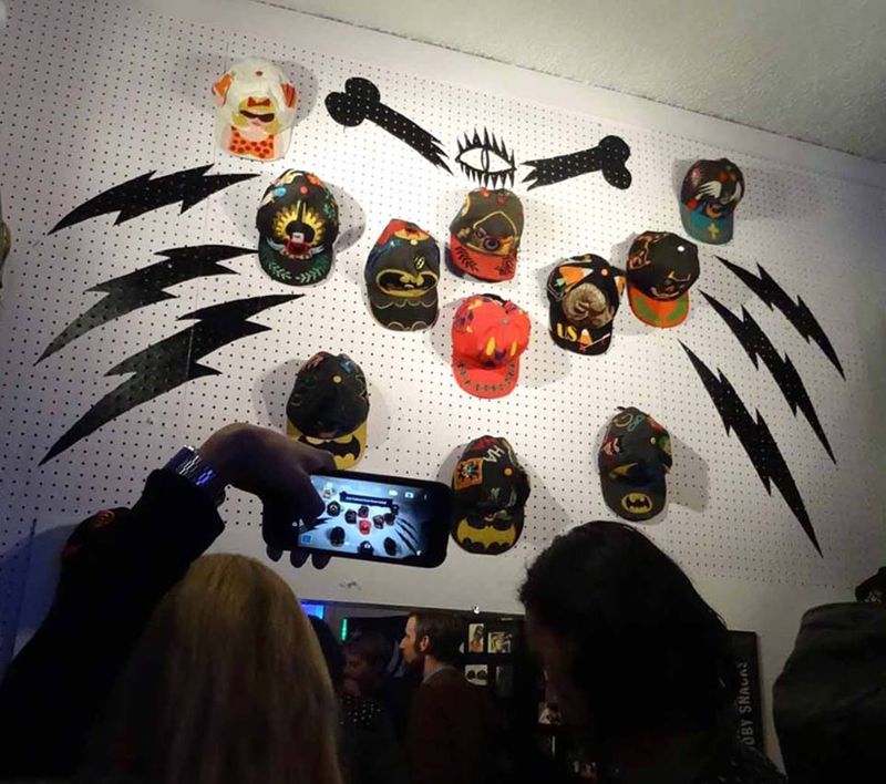 As part of the new exhibit, artwork from their extensive archive is currently displayed alongside the caps, featuring items like a studded-denim jacket once worn by a gang member, and a book of portraits taken by Patterson over a 15-year period by the front door of his gallery.