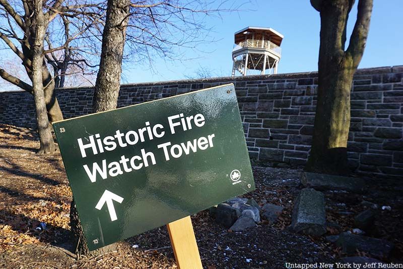 The Harlem Fire Watchtower was located at the highest part of the Acropolis (70 feet above ground, known as Snake Hill and built as part of a WAP project) in the center of Marcus Garvey Park (formerly Mount Morris Park), between 120th and 124th Street. The tower alerted all of northern Manhattan of fires — three bells for Yorkville, four bells for Bloomingdale, five bells for Harlem, six bells for Manhattanville, and so on.