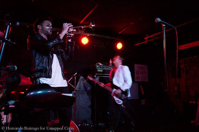 Black Taxi‘s performance at the Lower East Side’s Mercury Lounge on Saturday night highlighted CMJ’s closing night. The room was packed to the doors with vibrant and committed fans delighted to see the New York City four-piece band play their dance infused rock. Their set was a thriller, with front-man Ezra Huleatt captivating the audience as he moved around the stage and alternated between playing percussion, keyboards, trumpet and singing.