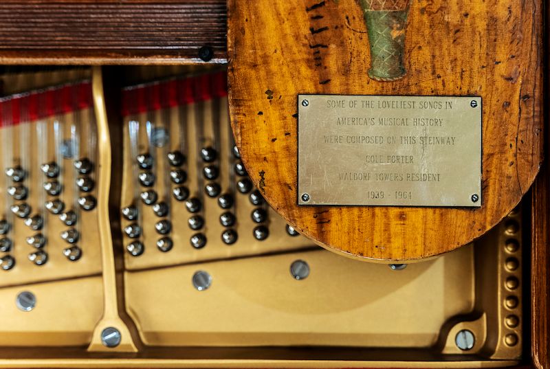 After Porter’s death in 1964, Frank Sinatra and his wife Barbara took over the lease and lived there until 1988. The piano was located in the Peacock Alley Lounge, just off the main lobby. The piano underwent restoration at the Steinway & Sons factory in Astoria and then spent some time at the New-York Historical Society, where guests enjoyed performances of Cole Porter classics by renowned pianists. It is currently back at the Waldorf Astoria New York in the sales gallery for the new residences. When renovations are complete, it will return to the hotel’s central lobby.