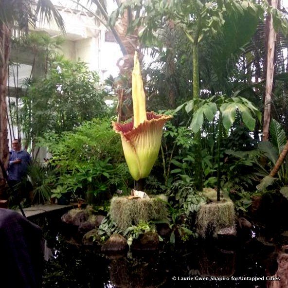 It’s the first time a titan-arum (one of its nicknames for short) has been on display at NYBG since 1939, and this specific plant was acquired in 2007. Two earlier versions of the corpse flower have been at NYBG, one bloomed in 1937 and the other in 1939. There’s a live cam on the NYBG YouTube channel, where you can see it in action. The bloom began yesterday at 3:30pm and is expected to last 24 to 48 hours. The museum has extended hours today as a result.
